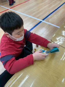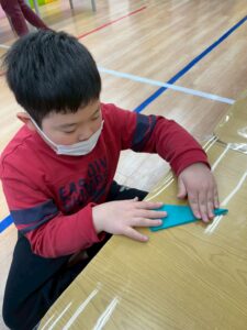 画用紙が重なってだんだん固くなりますが頑張って折っていきます!